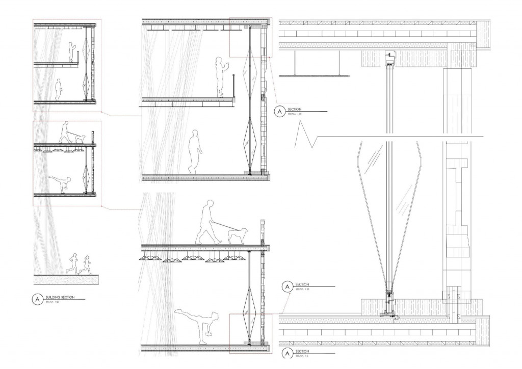The facade consists of main wooden “veins” supporting smaller wooden frames and ceramic modules. The ceramic elements follow the same shape, but vary in number, depth, and aperture depending on the internal program of the building.