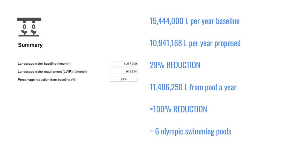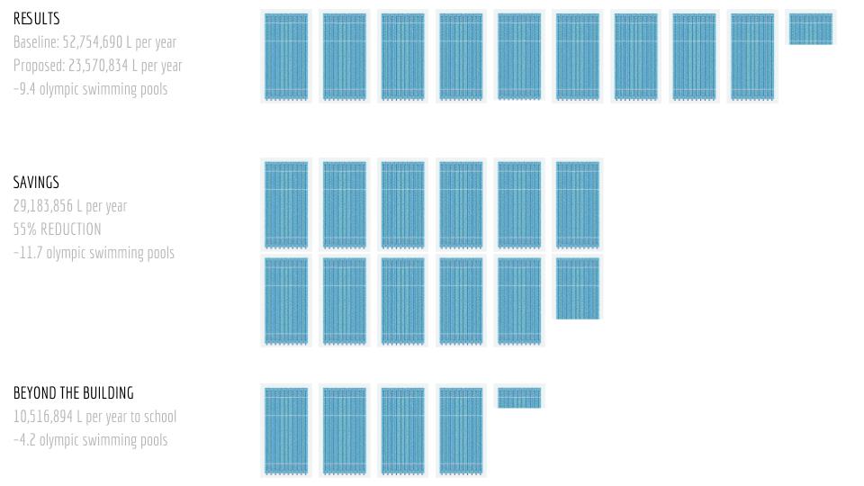 For our summary, we were available to reach a 55% yearly reduction on water consumption, which amounts to approximately 11.7 Olympic swimming pools, while donating approximately 4.2 Olympic swimming pools worth of greywater to the adjacent educational center.