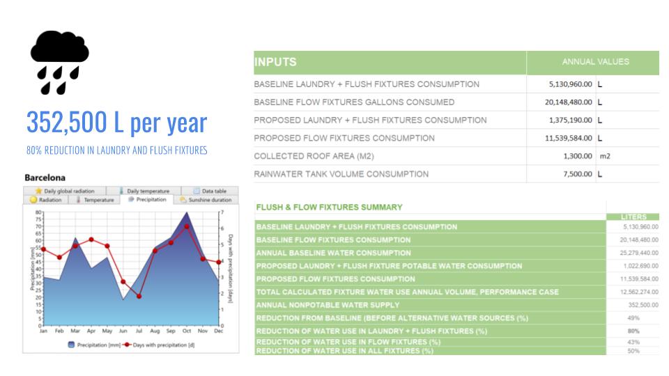 Since Barcelona has not many rainy events, the necessary access is to have two tanks of water recollection, one for rainwater and the other one from greywater.