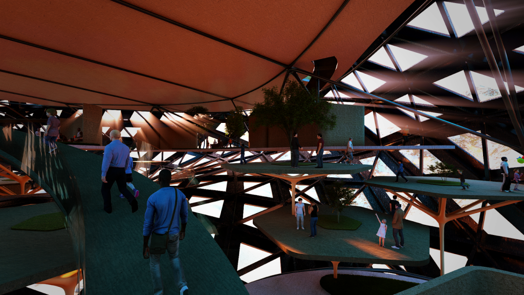 The concept interior view showing life in the building with greenery and how the ramp connects the various levels of the built form and how the platforms can be used to jump across the whole building due to minimum gravity on the moon.