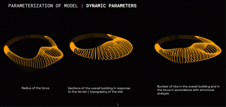 The parameters and the script are evolved in such a manner that the building responds to the terrain in which it is situated. The dynamic parameters influencing the design are