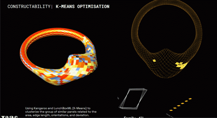 The panelisation is optimized into average sizes using K-Means clustering, an AI technique of optimising panels which is then optimised further using kangaroo and genetic optimisation.
