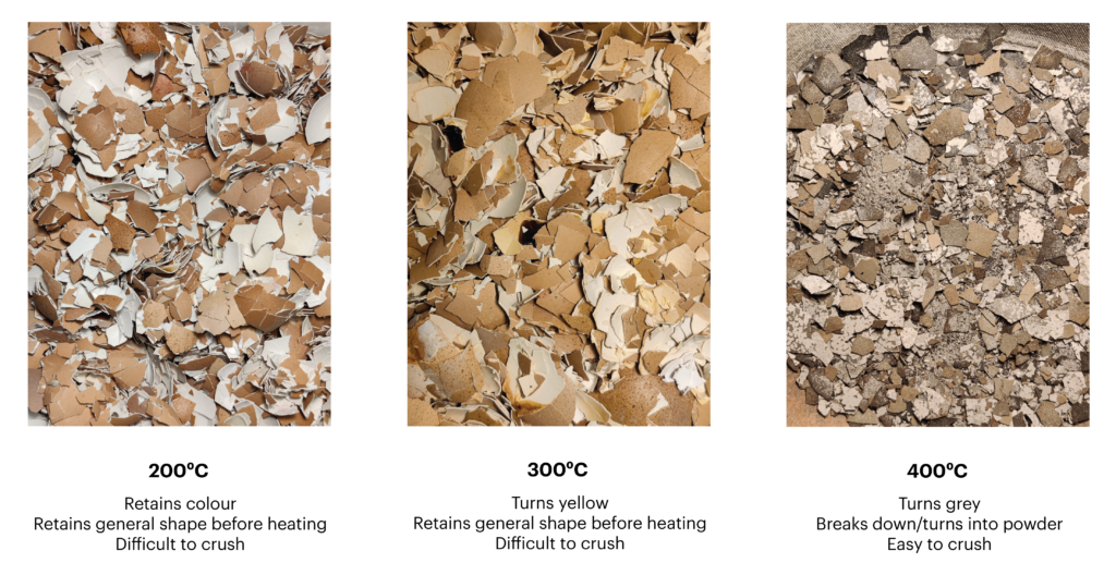 The goal was to crush the eggshell into small enough particles that they could easily mix with the starch and clay. I found information online that suggested to boil the eggshells first for 15 minutes to sterilize them then to heat then in the oven at 200 degrees celsius for 20- 30 minutes then to grind them into a powder. I found that the eggshells were difficult to crush into a fine powder. I attempted using a blender, a rolling pin and a mortar and pestle however the eggshells remained in large pieces than the maximum 2mm I was aiming for so I attempted higher temperatures to see if the eggshells could be ground more easily. I found that it was easier to grind the shells after burning them at 400 degrees celsius in a kiln. There was not much of a difference in the ease of grinding at lower temperatures. I did not go beyond 400 degrees as the eggshells began to incinerate and I did not want to heat them to 500 degrees at which temperature the calcium carbonate would break down into calcium oxide and release carbon dioxide into the atmosphere.