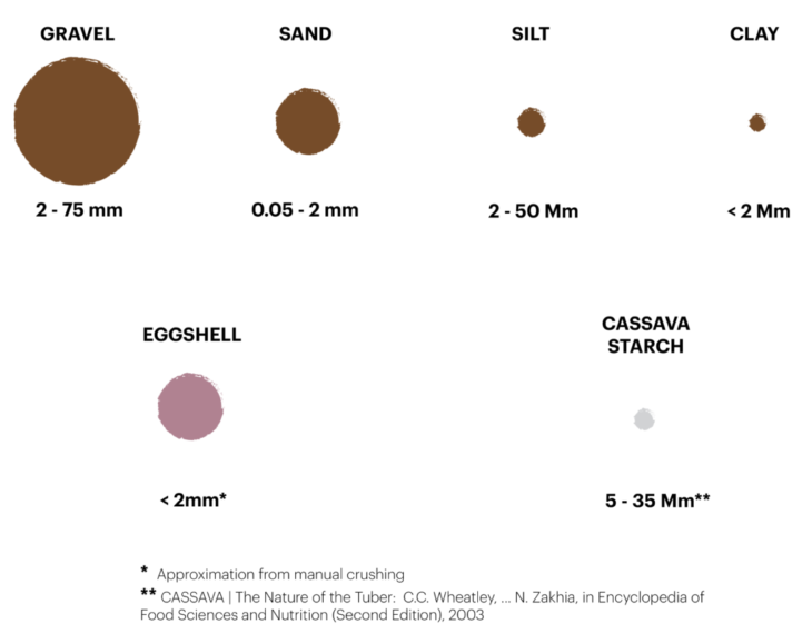 Soil is typically a mix of gravel, sand, clay and silt which have varying particle sizes and act together with the smaller particles filling the voids between the larger ones. The more densely packed the material the stronger the soil is. At Valldaura I had access to pure clay. It is typically bad for earth construction because there is no interlocking between the particles, and clay tends to shrink significantly upon drying. In adding eggshells and starch to it I hoped to improve its characteristics as a construction material.