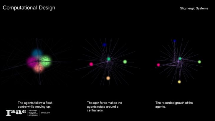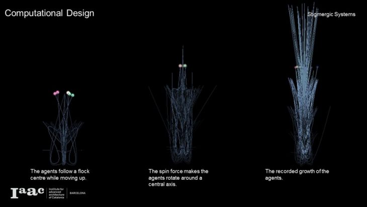 The exercise aims to code a cylindrical geometry to form a stigmergic system within that geometry. The definition was split into segments where there are a set of points that act as agents that are being followed in addition by another set of agents. Both the sets are populated from the same geometry of a circular base. Hence the various possible outcomes are predicted depending on the number of iterations run in the code. There are three factors which in turn affect the growth of these agents. A spinning force growing from the bottom to the top, a flock movement to attract the agents towards a mean average center and a steering force to drive the agents.