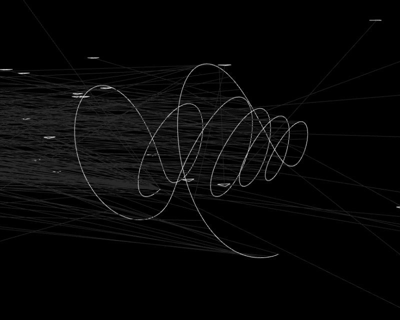 As a starting point we introduce an initial Lorenz Attractor curve from Chimpanzee plug-in. The exploded curve gives us a reference for displacement and pulls these points during the interaction between the curve and boids and by this phenomenon, develop a more dynamic curve. An analogy can be drawn with birds going through a storm cloud.