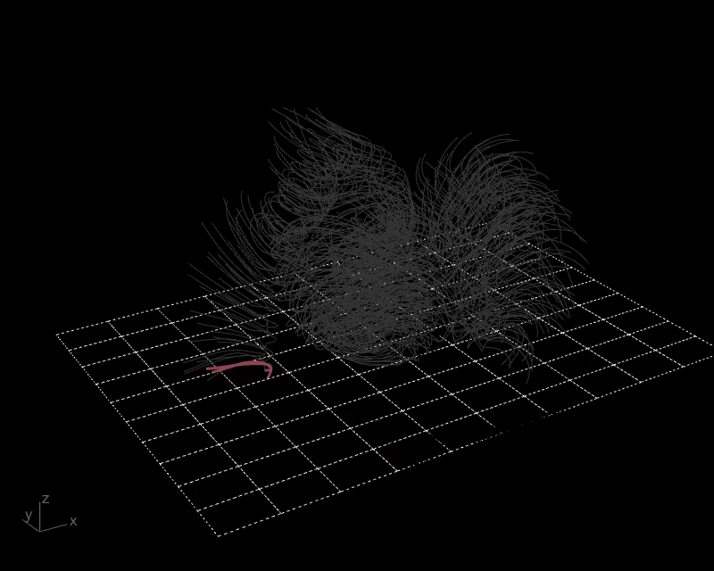 Then we look at the magnetic field spin force around the curve. Using the piped curve, we generated a point cloud on the surface, using the base curve frames for the spin force. Then the curves grow around the frames upto a maximum of 157 iterations to generate magnetic fields curves around the pipe.