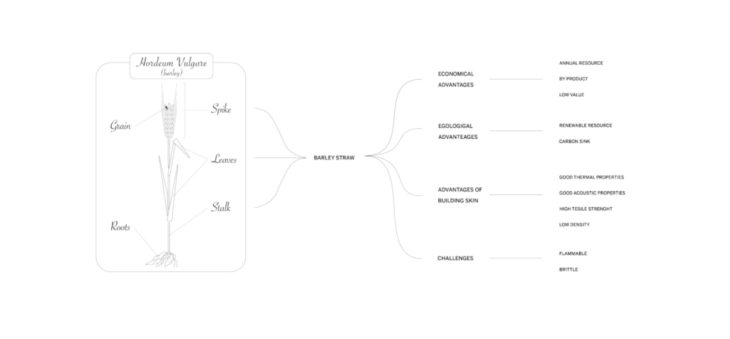 The proposed material system will allow for the implementation of straw as a building material for larger scale constructions by allowing more geometrical freedom in the form of the building skin. This is achieved through a material system composed of an outer layer of composite straw panels with a natural resin that are bolted to a lime-straw insulative layer.