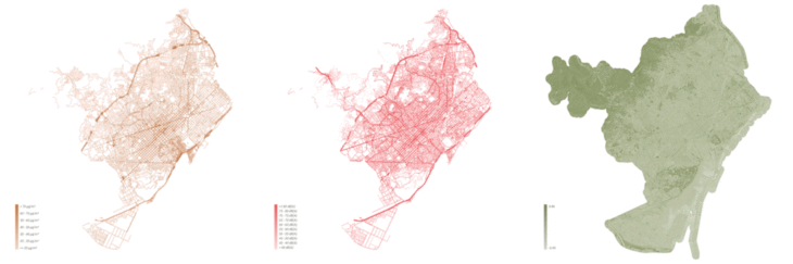 For the green experience, the path with the most trees can be selected by matching the number of trees in Barcelona to the nearest road.