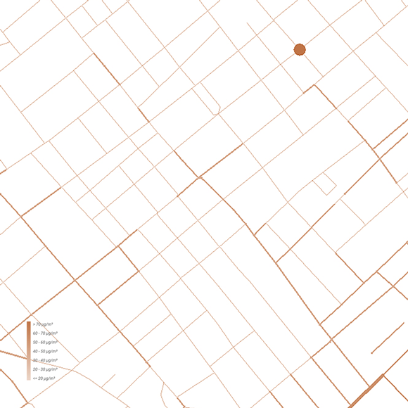 Based on the pollution level for each road, the difference in line thickness and color is used to suggest that pedestrians can take a route on a road with a lower air pollution level through the air pollution level data.