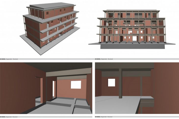 After research of the different construction systems, we concluded that the most prevalent one is the modern heavy structure with 3 main continuous beams and supports that can be moved through the main axis of the beams so as to provide more freedom to the interior spaces. Below we created a 3D structural model of the main structural elements and the bracing walls in red.