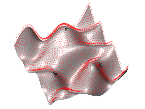 We realised that the topology of the initial geometry and its surroundings played a crucial role in the final output. The mycelium growth algorithm, for example, when applied to curved surfaces tends to approximate geodesic patterns as it avoids areas of high curvature to avoid wasting energy. Differential growth could be “directed” by increasing deforming the initial shape or by locating obstacles in its way.