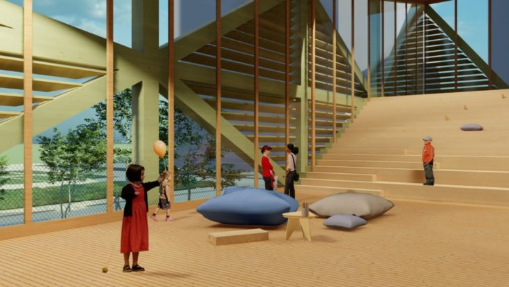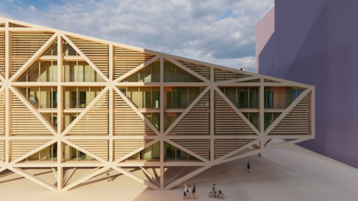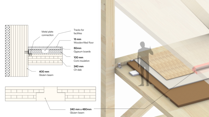 It is composed of glulam beams, CLT slabs with cork insulation, gypsum boards, wooden floors and a track for facilities, in addition to a treated pine façade.