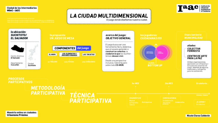 El proyecto Suchitoto, La Ciudad Multidimensional, consiste en desarrollar una juego de mesa de roles, en base a los diagnósticos previamente facilitados por la ciudadanía, en el que, de forma colaborativa y con perspectivas diversas. Busca, construir en colectividad, ciudades más justas; inclusivas; tolerantes pero por sobre todo, con un alto sentido de los cuidados. Esto a través de la interacción entre sus jugadores, sus sentires y su