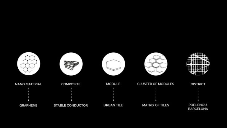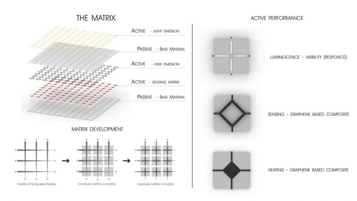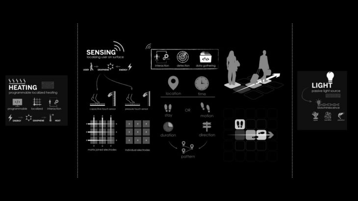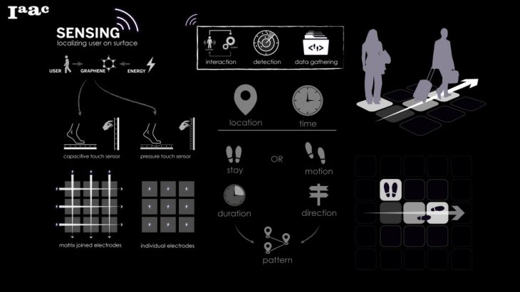 Synapse_2.0 develops a smart material (graphene) based system for monitoring data of urban flows in the cities. Using the conductive properties of graphene, the material system developed, presents embedded capacity of sensing and actuation. The developed material composites prove to be suitable for contributing in an urban environment. By recording traces of footsteps the system can provide accurate, antonyms, large-scale spatiotemporal information as well as dynamic occupancy maps, trend prediction, and real-time urban interaction pedestrian information.