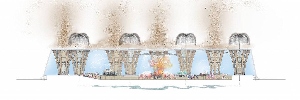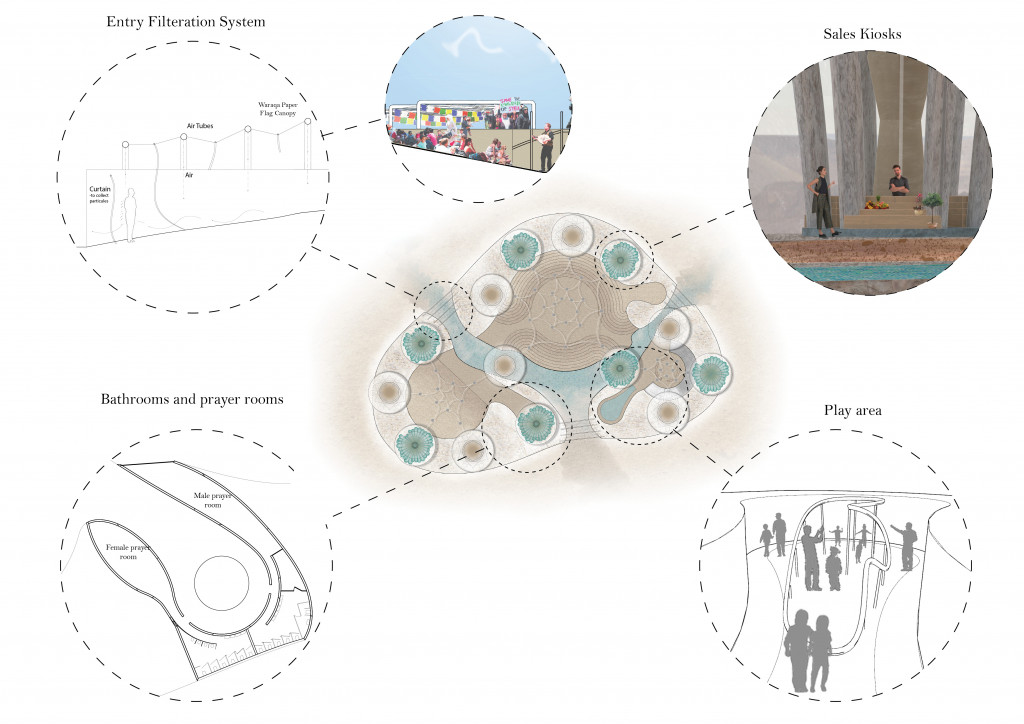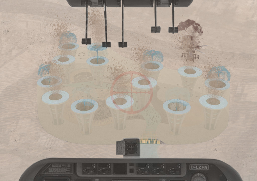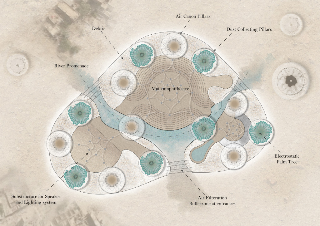 Oasis, a public plaza, is intended as an urban safe zone where visitors are protected from the harmful airborne particles and which actively defends citizens against aircraft attacks.
