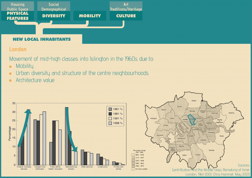 Gentrification orginally comes from the English word Gentry, which evolves from the Old French word genterise, and means of noble birth. The term was first used by sociologist Ruth Glass in 1964.She was studying the new movements inside Greater London, and detected an increase of Londoner of middle-high class moving back from their outskirt neighbourhoods into central areas of London like Islington. They came form a change of the employment structure in London, where a shift from blue collar to white collar jobs was happening. By moving there and refurbishing mews and Victorian Georgian and Victorian houses, they displaced the lower income classes that populated the area. She concluded they were after culturally and urbanely richer and more diverse areas.