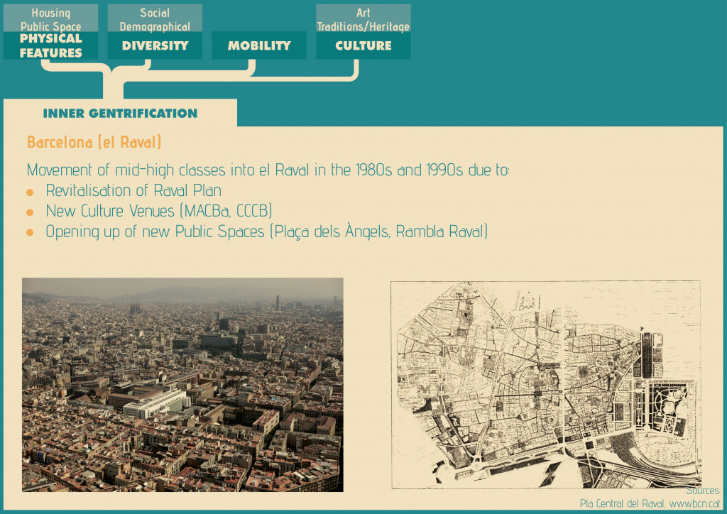 Barcelona has also gone through a phase of inner gentrification during the revitalisation of the El Raval neighbourhood.The Raval was an area were the low hygiene and lack of services pushed the lower income citizens to that area which in turn made the area more prone to dangerous activities and closed a vicious circle.In response to this situation the city council developed a Plan for the Renovation of Raval that included a very similar model than that of le Marais in the 1970s.