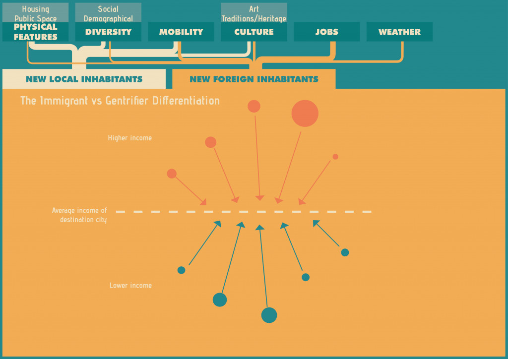 However, an important distinction is to be made between the immigrants and the gentrifiers. In a nutshell, immigrants are citizens of low income that come somewhere that has a higher income average, in hope to improve their lives. As a citizen of low income, an immigrant is usually pushed to the areas of lowest income of the city, and will cover the lowest side of the demand. They do not gentrify. A “gentrifier”, on the other hand, would be someone of higher income, that moves somewhere of lower income, moved by a series of attractive points and is able to find a higher value in their income.