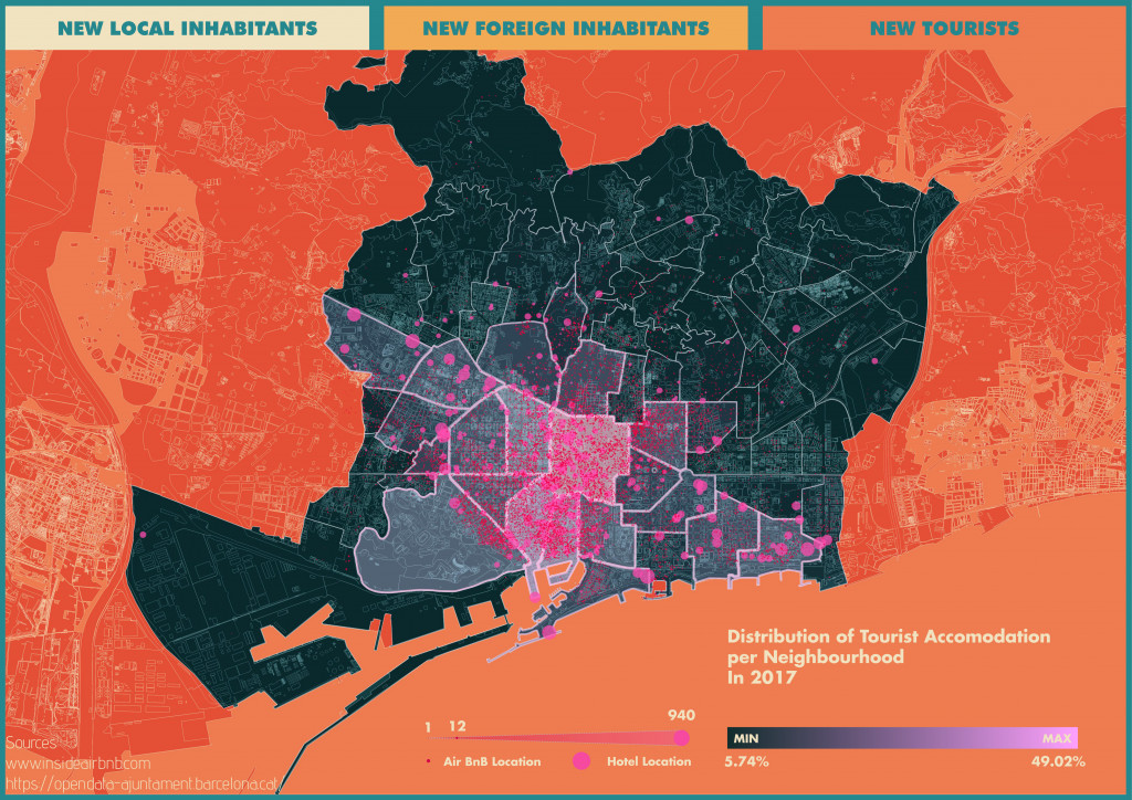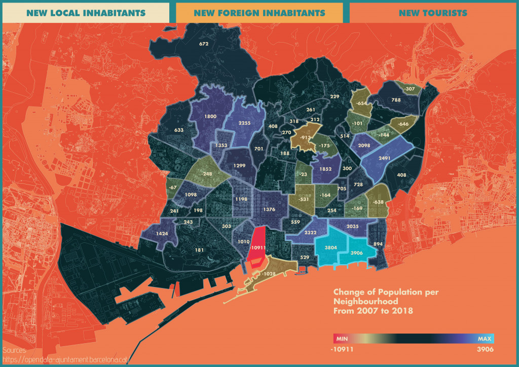 In case of Barcelona the touristic pressure can be mapped by simply rationalising the population of each neighbourhood with the concentration of Airbnbs and Hotels.It is interesting to note that the depopulation of locals is at its maximum in proportion to the number of touristic accommodations in proximity.