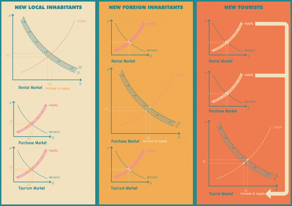 One of main impacts of all types of gentrification is an economic one. Using the economic model of supply and demand it is interesting to note the behaviour of the rental, purchase and touristic markets in relation to one another.