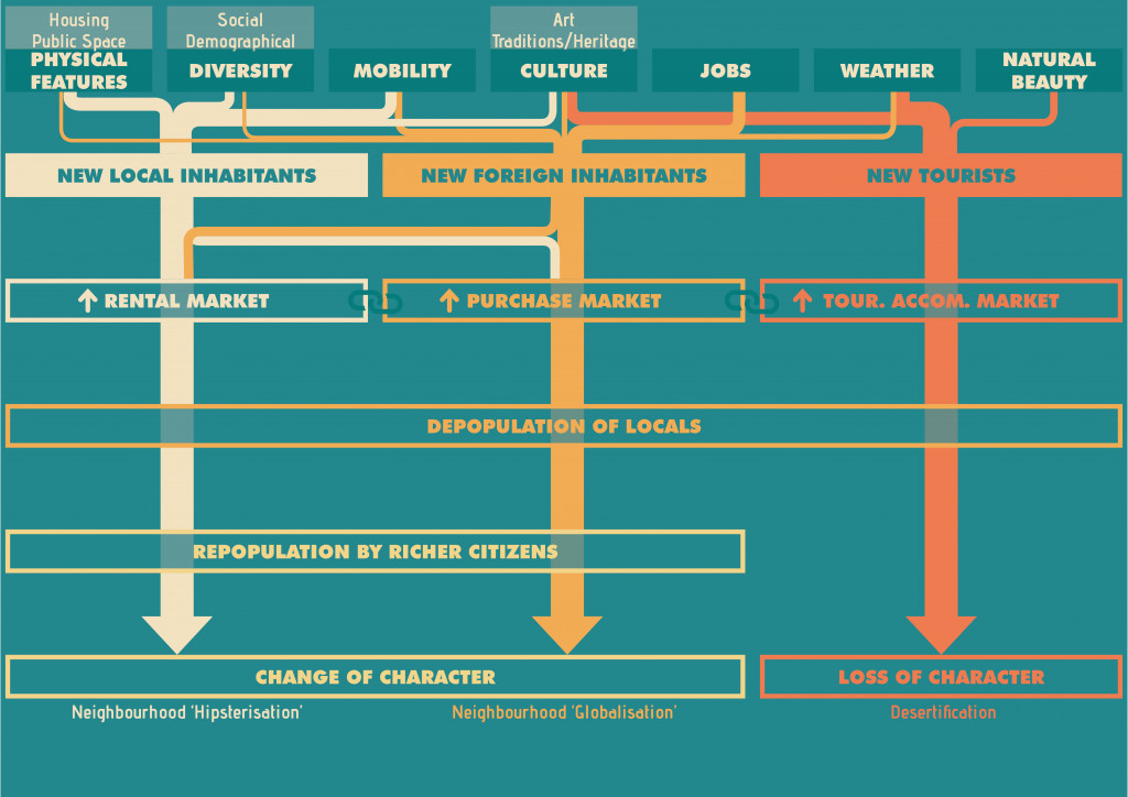 When an area suffers from inner gentrification, a pressure on the rental market appears. This is obviously a simplification, as locals also buy apartments, and therefore pressure is also applied to those markets.When the demand rises on those markets, the market naturally increases the supply to reach the balance point. To increase the supply in a finite market where hardly any new product is produced (or built, in this case) the market will pull the new quantity from other markets. If the rental market requires more flats, it will pull them from the purchase and from the touristic market, as well as other markets (such as the office, and other uses).