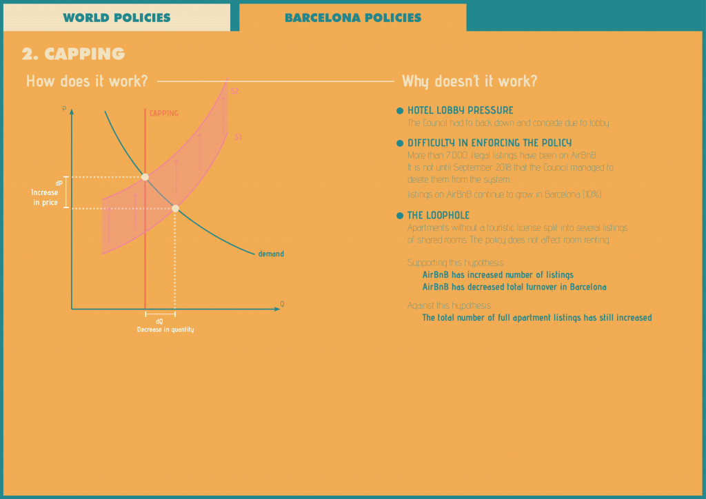 - On top of plainly illegal listings, the Market exploited a loophole on the touristic apartment cap. Since the policy does not affect room listings, but only full apartments, an apartment listing that does not obtain a license can be split into as many listings as rooms and be invisible to the policy, while still being fully used for touristic purposes.