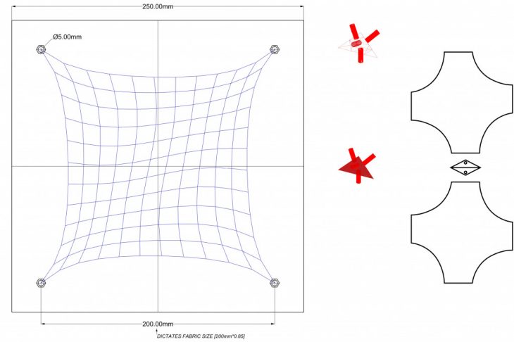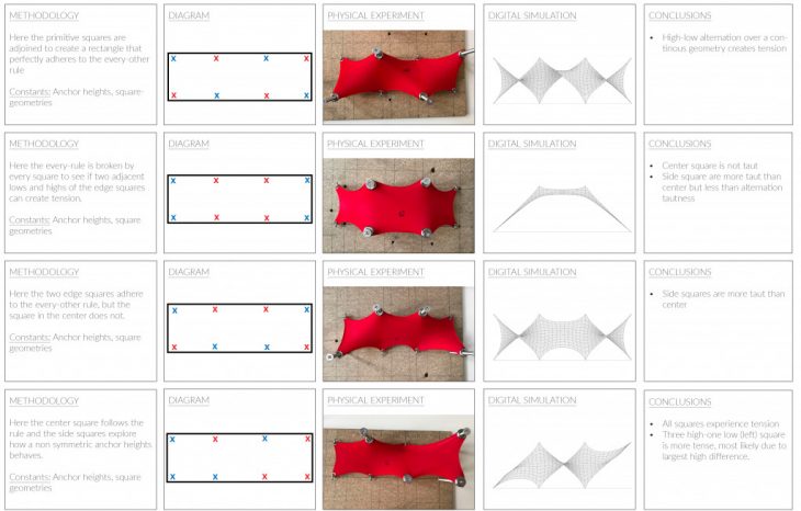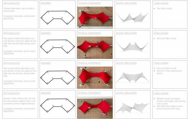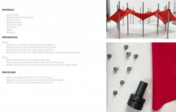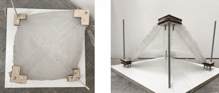 The material behaviour experiments were conducted within an apparatus developed during the term by the students. The objective was to understand the way tensile structures work, in order to later use the tensed fabric as a mold for casting the final structure’s modules.