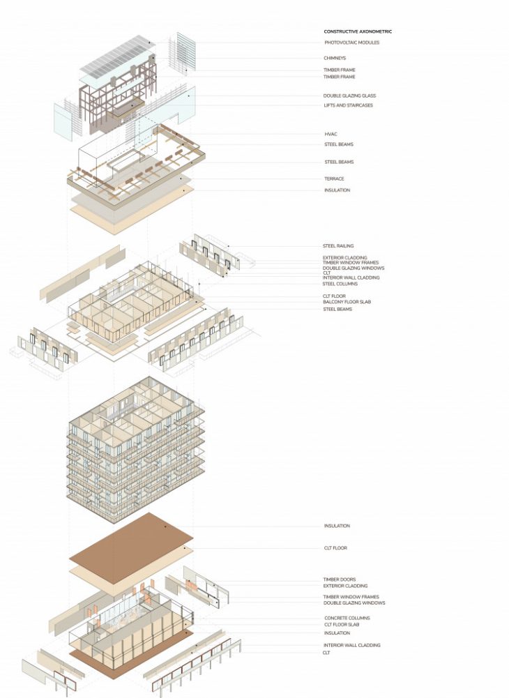 Following the analysis of the building, the first attempt is to visualize the axonometric layers of the mass timber co-housing complex.