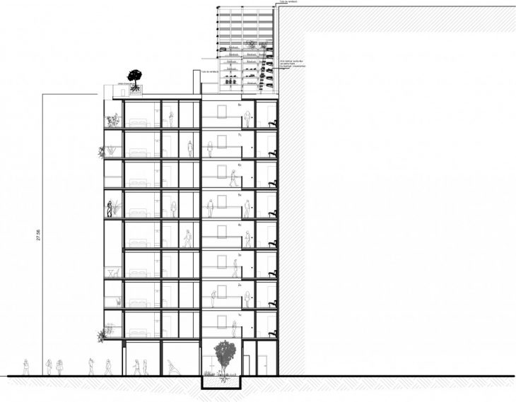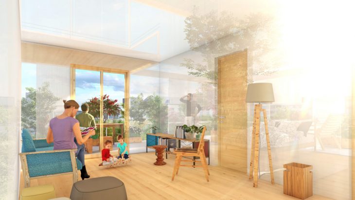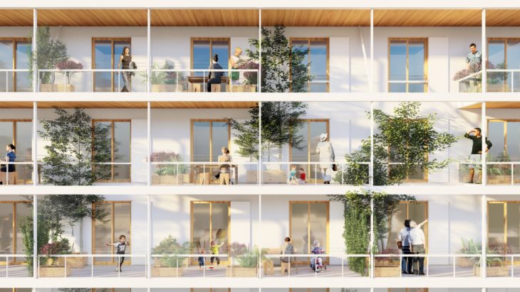 The project is open in 3 directions surrounded by terraces on the outside and on the core. The walls and floor will be constructed with CLT slabs and panels sitting on a concrete ground floor. The project will be on 8 floors, with 5 units on each floor.