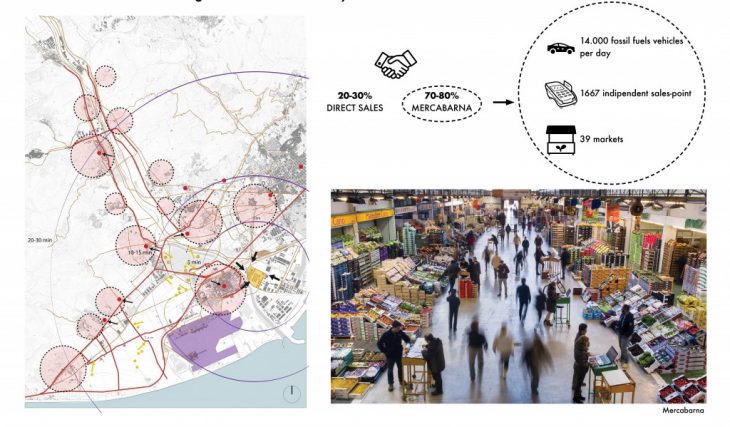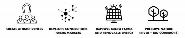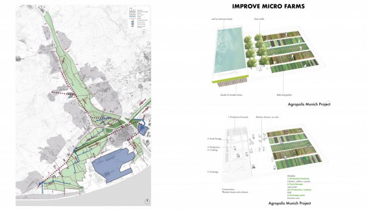 The proposal wants to improve the existing farms and the realization of new micro farms in strategic locations. The new micro farm design is based on the one by the Agropolis Munich proposal and it hosts food storage as well as productive livestock, production, manufacturing and exhange.