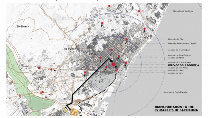 Mercabarna is the main food supplier of Barcelona. It is estimated that 20% of the fresh vegetables and fruits in Mercabarna are coming from the agro-park. Of this that 20-30% of the sales of the 1667 independent sales points in the 39 markets of Barcelona is direct sales and 70-80% is negotiated in Mercabarna. The latter is estimated that causes around 14000 fossil fuels vehicles per day transporting food from Mercabarna to the 39 markets of Barcelona. The map below shows the how the food is today transported estimating around 10-15 minutes car drive.