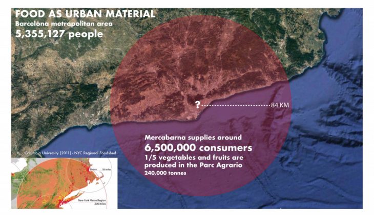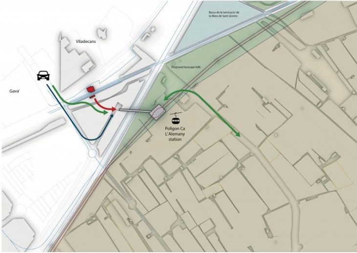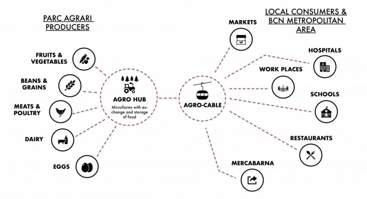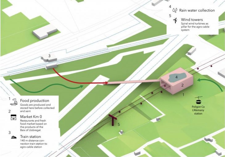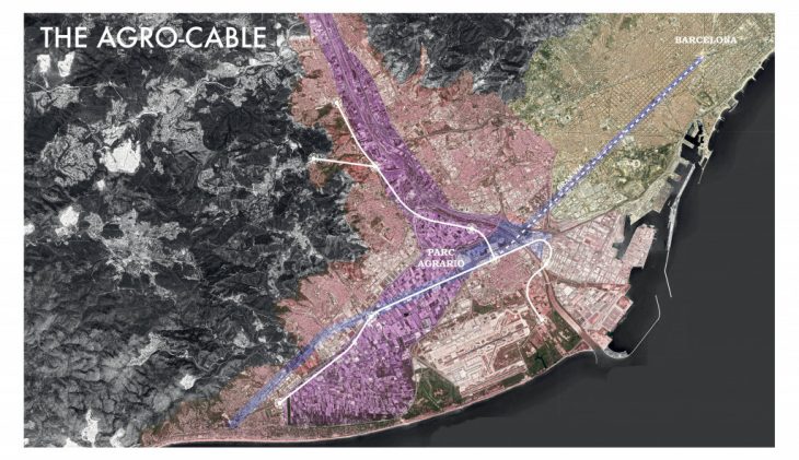 The first stage of this project involves a radical vision in the urban design and planning of the city of Barcelona. The main idea behind the approach is the linear connection between the farms and the city. The project wants to create an alternative and sustainable solution to transport food with a new electric aerial cabin lift system which drive food and passengers through renewable energy