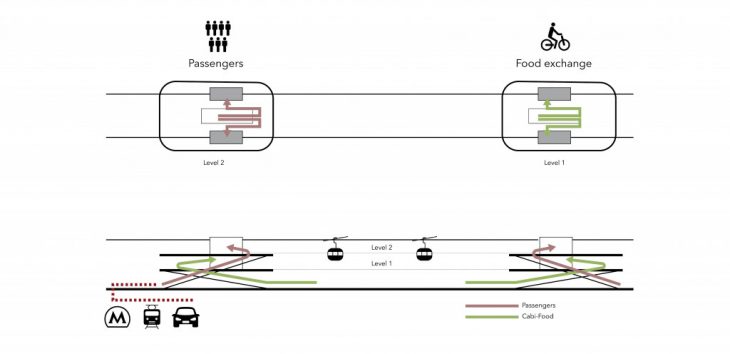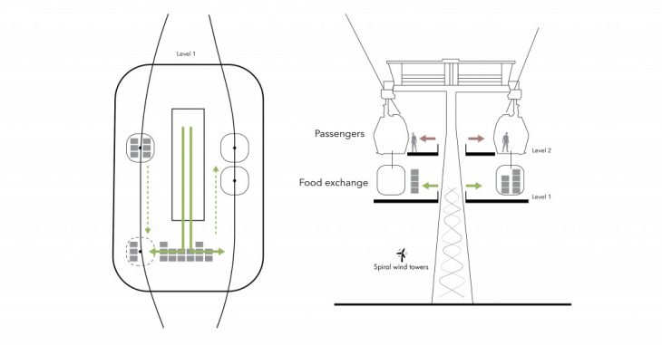 The proposal foresees two different levels for passengers and food. When the food cabin is ready to go, it is connected to the passenger cabin.