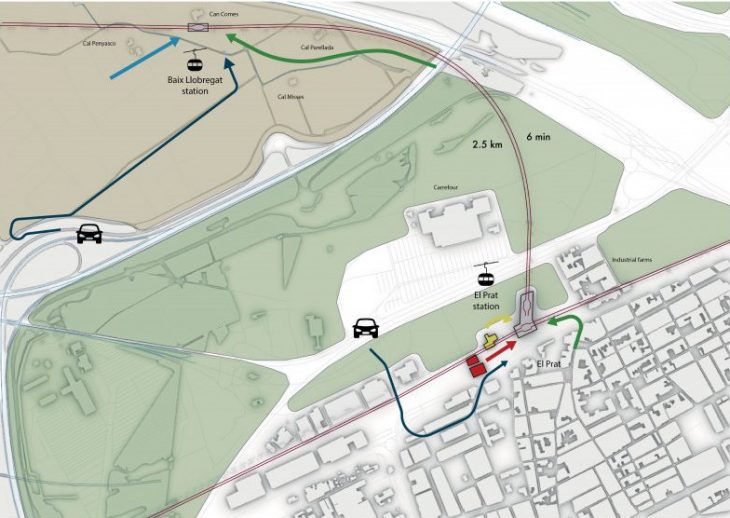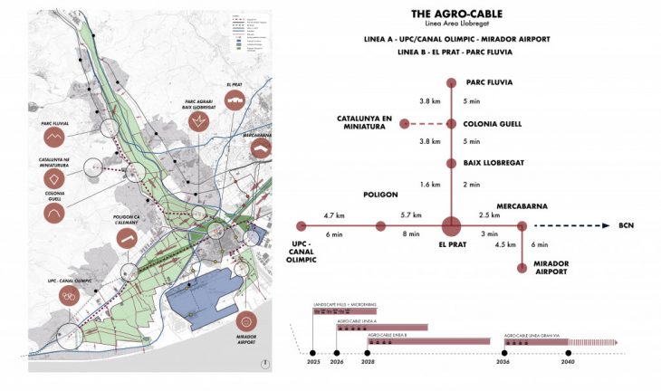 produced by wind towers. The Agro-Cable is integrated with the Barcelona Metro system, train network and the xarxa viaria. In addition to transport across the park, the service advertises the concept of Food Highways and a “unique view of the Baix Llobregat”.
