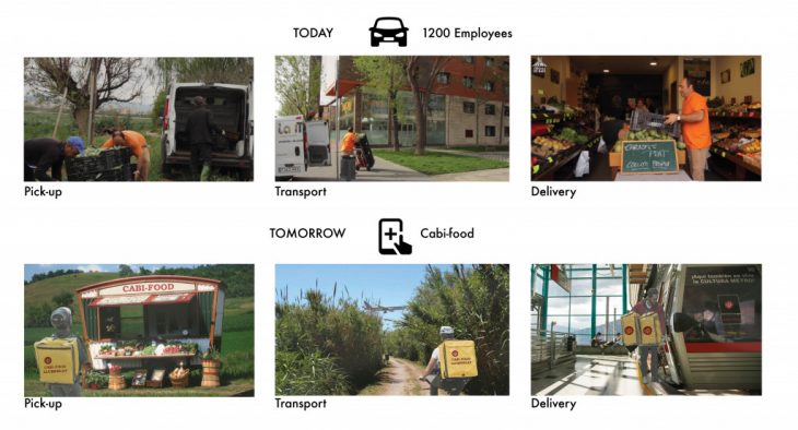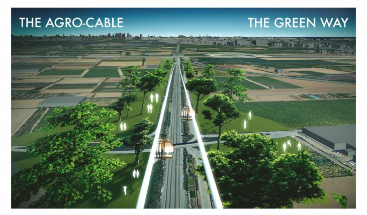 The main idea behind the approach is the linear connection between the farms and the city. The project wants to create an alternative and sustainable solution to transport food with a new electric aerial cabin lift system which drive food and passengers through renewable energy