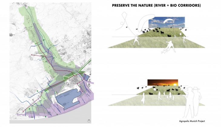 The proposal wants to preserve the areas around the river and the existing bio-corridors. Moreover, it foresees the creation of new green urban areas with new trees to prevent desertification of the areas around the river and the highways/railways. Those green spaces want to be natural hills in order to also create an acoustic barrier for the agro-park.