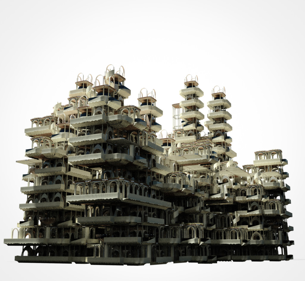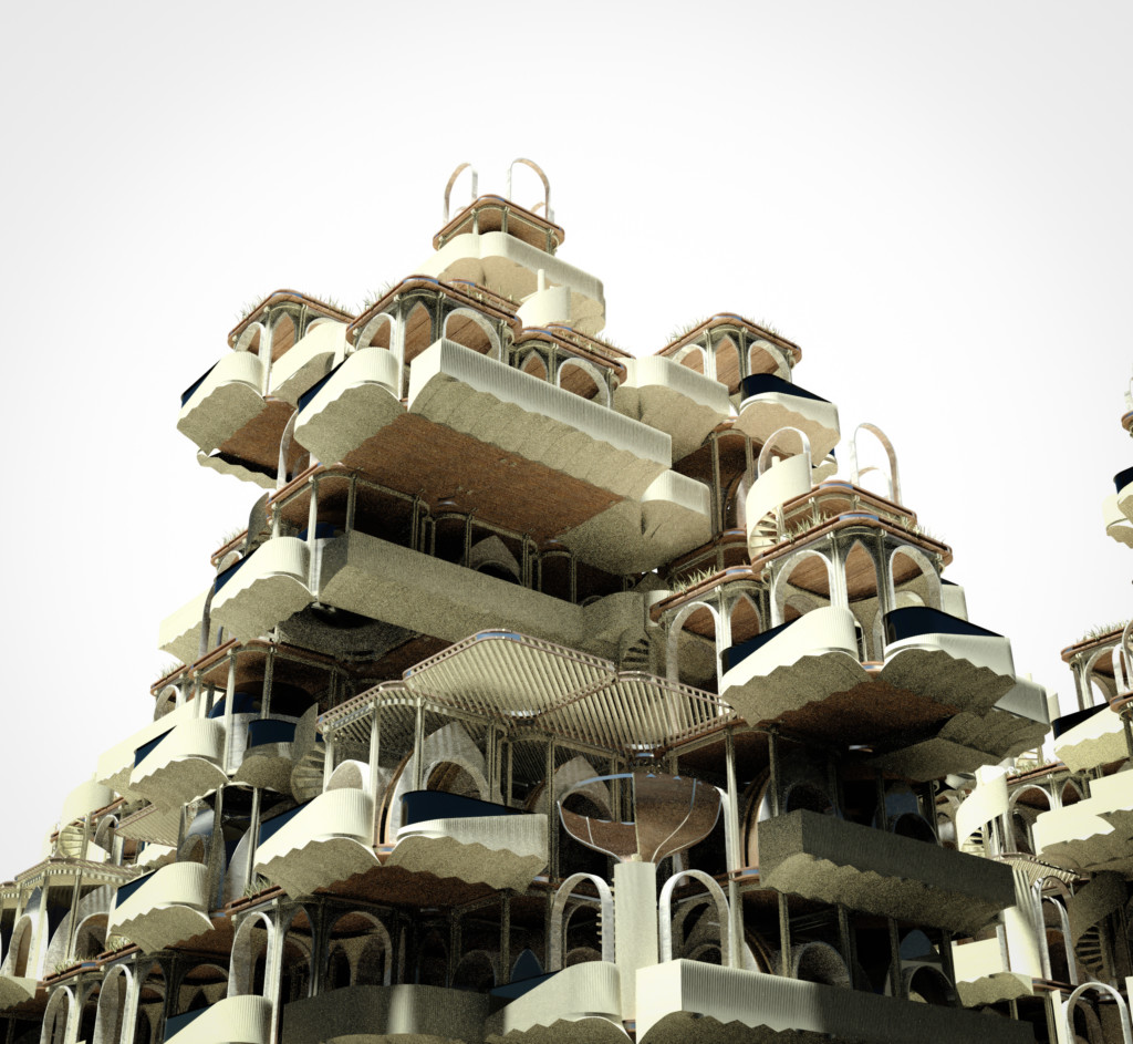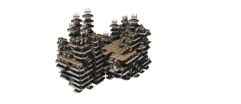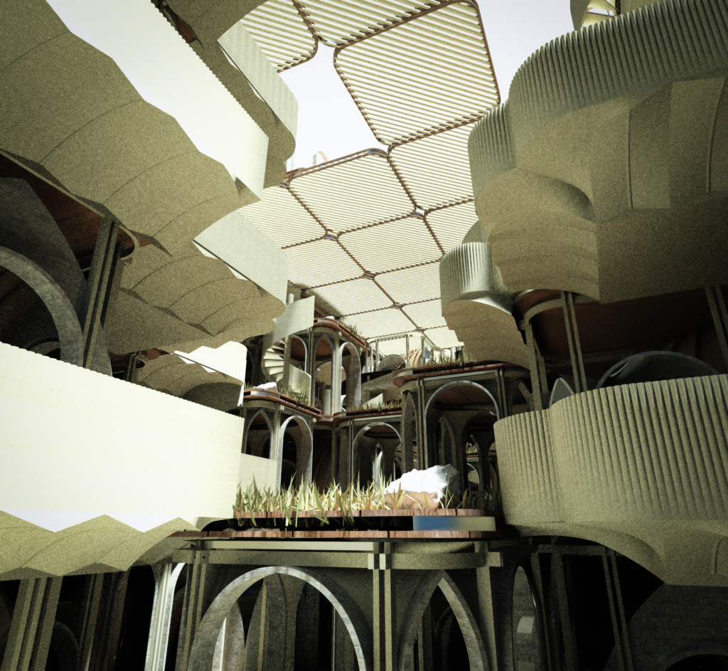 The project dives into series of members making families for aggregation with arc geometries reimagining the classical shape blended with hanging terraces to form the growing architecture embedded with a massive floating space.