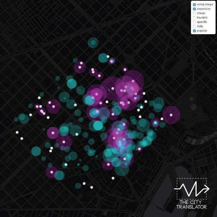 The commercial activity and products are described and categorized in touristic, cheap,  expensive, popular, daily and specific according to city terminology.  The data is collected from open street maps, tripadvisor and twitter to define the terminologies.  The data is overlaid with the empty shops which are for rent in the selected area.  An interface is developed by mapping all the categories which allows citizen to make decision to sell their products.  The interface “The City Translator” is an interactive map to help citizens find the best place to sell their products where the details of price, size and categories for rented shops is displayed on selection.
