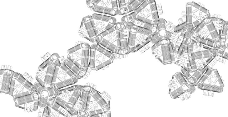 The H-Factor consisted of an intense exploration and work with different kerf bending patterns. This technique was used to achieve flexibility in the plywood, to allow for the creation of an aggregatable module. The module was assembled with H-shaped press fit joinery that connects the kerf elements to a rounded tetrahedron module. Each module can be connected to another module through the sharing of the H-connector pieces. The aggregation could theoretically continue indefinitely as multiple repetitions of itself.