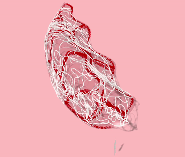 Running a live physics simulation using kangaroo for grasshopper, we were able to emulate a spaghetti shaped lattice on our base surface. Due to aesthetic reasons we decided against planarized panellization strategy in order to create a more form and topic related outer surface. Therefore we used 4-5 types of our generated pasta shapes and ran the simulation on it. For the simulation we used different types of curves and lengths, which we mapped on our surface. Later on we released them, in order to enable the differential growth alongside the surface, whilst avoiding collisions we used the following “goals” in kangaroo: