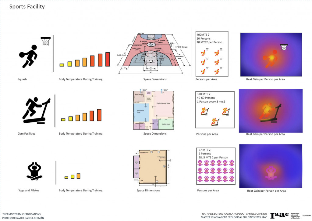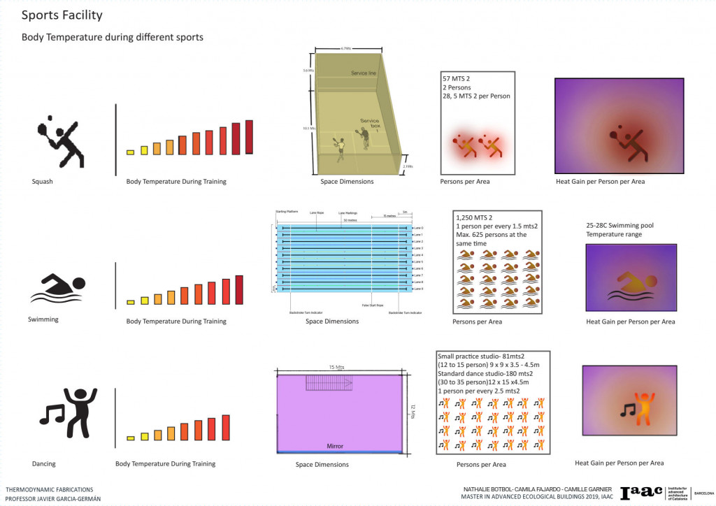 Following the wind analysis, one of the most important factors of our project is that is a Sports Facility, meaning that it has different activities with different program requirements and quantities of people per area. We decided on the sports that are taking place in the facility, the body temperature, and caloric waste, the space requirement and the number of people per space and analyze how the body heat, together with the space size and persons per sports affects the thermal behavior of each area. This helped us decide the areas where each sport should be located in order to either absorb or release heat.