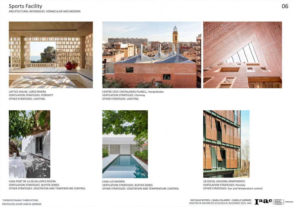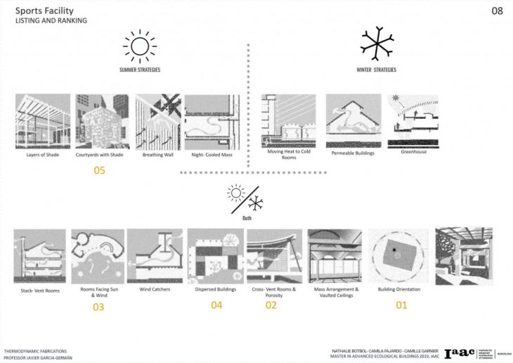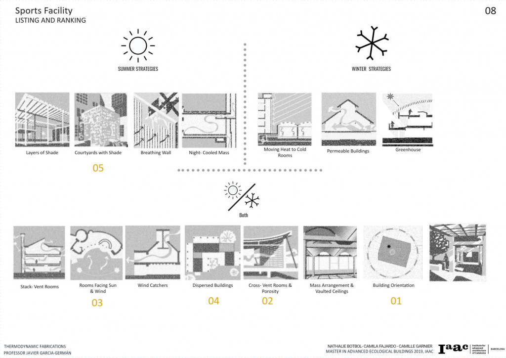 The following step was to look at case studies and analyze what each project did to passively heat or cool down the building, later study if the strategy will work for our project. From the selected strategies, we divided them in summer, winter and year-long strategies, later on, select the top 5 strategies that will have a priority in the project development and thermal function.