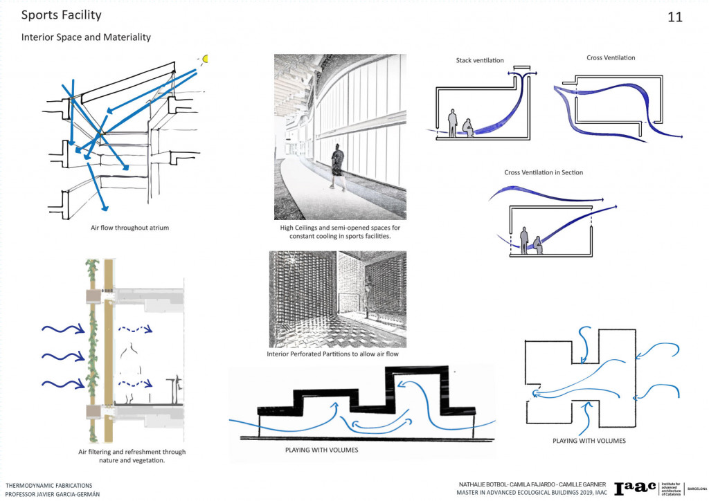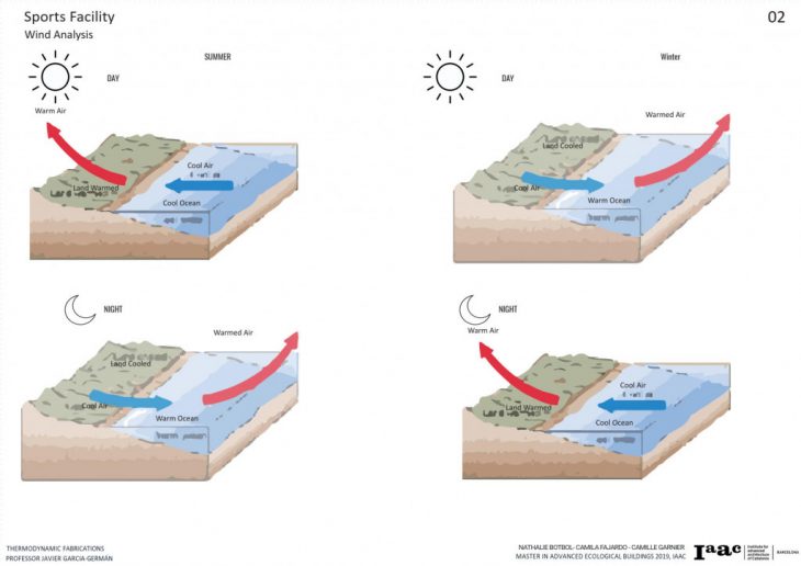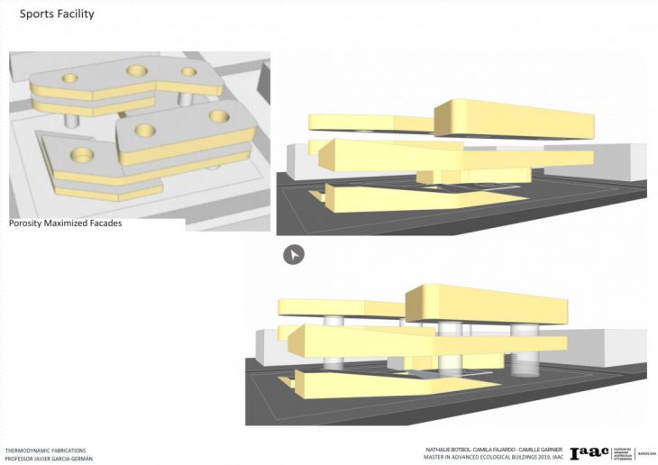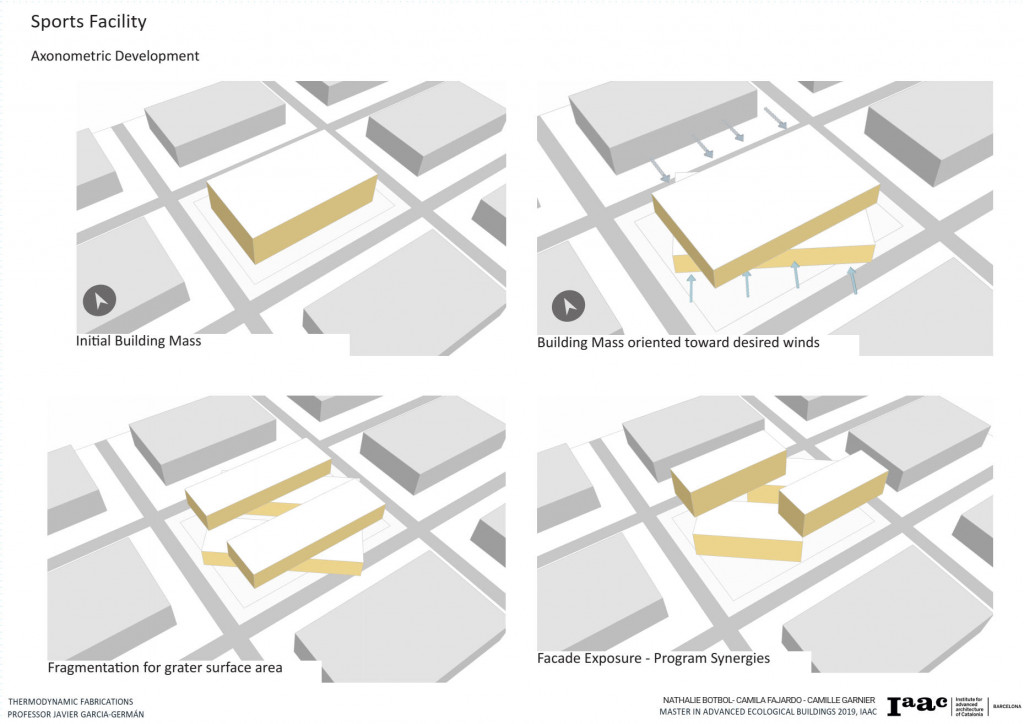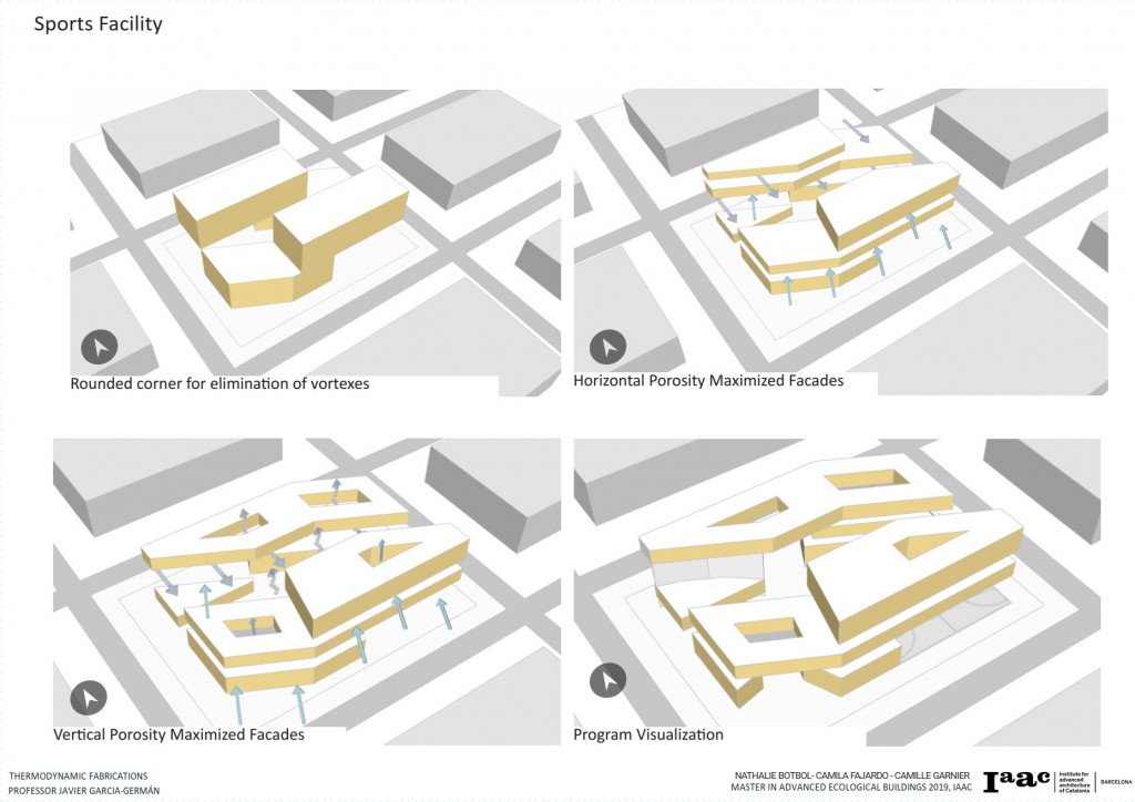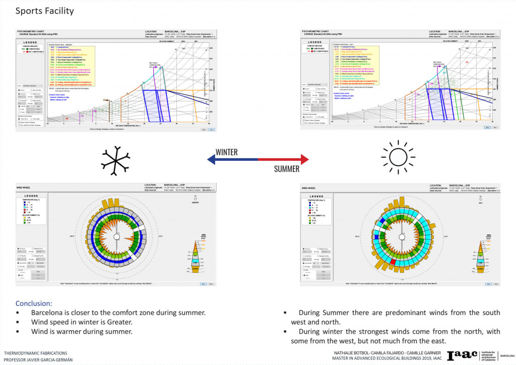 The Project is located in Barcelona, is a Sports Center for the community and the intention is to have it completely self-sufficient. In order to understand the best approach to the thermal efficiency of the project, we decided to focus on a single main climate item that will impact the most in our facility. We decided to go with the wind because a sports facility needs constant cooling and air circulation to avoid heat concentration and other factors that come when practicing sports.