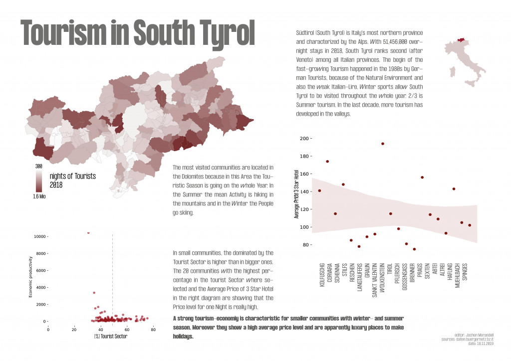 The most visited communities are located in the Dolomites because in this Area the Touristic Season is going on the whole Year. The mean Activity in the Summer is hiking in the mountains and in the Winter the People come to Southtyrol to ski. In a lot of small communities, the dominance of the Tourist Sector is higher than in bigger ones. The 20 communities with the highest percentage in the tourist Sector where selected and the Average Price of 3 Star Hotel in these communities shows that the Price level for one Night is really high.