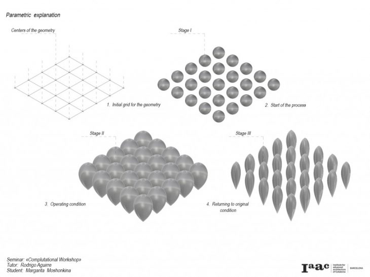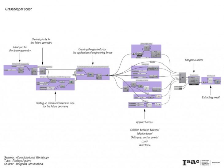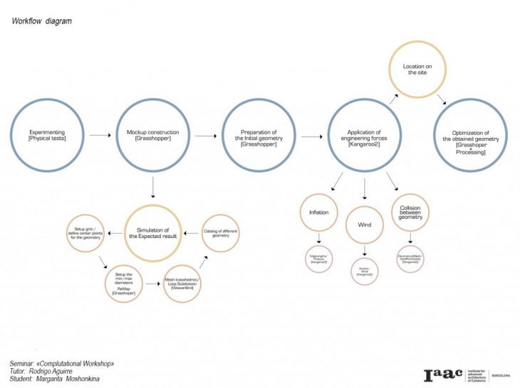 Workflow explanation: first of all was important to made a MockUp to set the initial geometry. Later on apply engineering forces such as wind, inflation and collision between geometry. The last stage was to locate the resulting geometry to the specific location and using processing made a simulating and optimization.