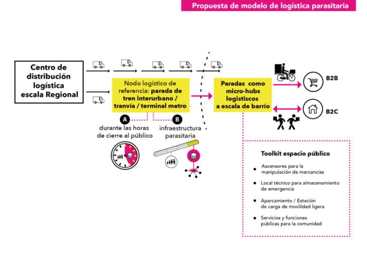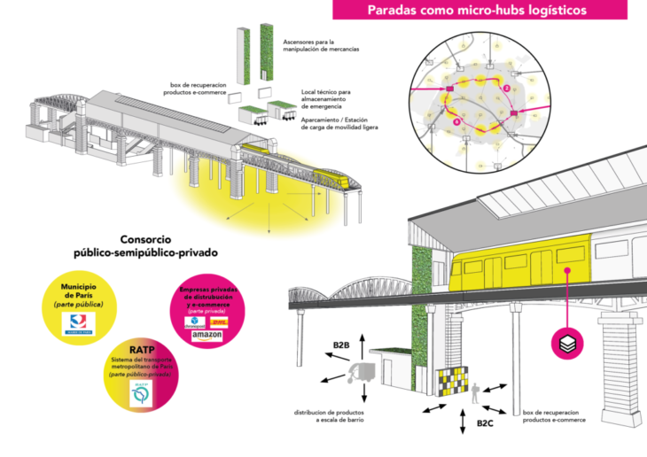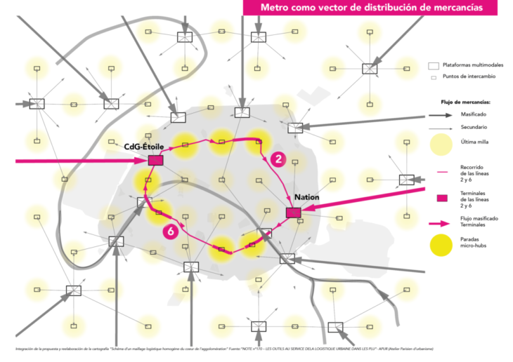 La estrategia prevé la creación de dos microcentros logísticos en proximidad de las terminales Nation y Charles de Gaulle-Étoiles. El escenario objeto de este estudio plantea la utilización del metro – en su funcionalidad de “cargo” – simultáneamente con el transporte de personas, dedicando un vagón/compartimento especial (al principio o al final del tren) al almacenamiento exclusivo de mercancías. A continuación, el contenido se ordenará a escala de barrio en determinadas paradas de la línea, elegidas estratégicamente según criterios de mayor adaptabilidad a la nueva funcionalidad propuesta. La frecuencia supuesta es de 2 a 4 veces al día y los horarios de funcionamiento del metro-cargo se establecen tras un análisis de los flujos de personas usuarias del metro de manera que tengan un impacto mínimo en las operaciones normales de transporte de pasajeros. Además, de este modo, en la estación, el personal responsable puede realizar paradas de mayor duración y así tener el tiempo suficiente para descargar el material destinado a la parada correspondiente. Desde aquí, la carga se desciende (o se recoge, dependiendo de si la estación correspondiente es elevada o subterránea) mediante ascensores específicos instalados a tal efecto.
