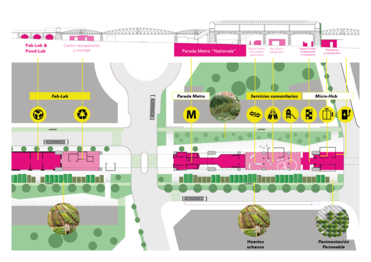 Las paradas del metro se convierten así en nuevos lugares equipados con una multiplicidad de servicios. En la parada Nationale, por ejemplo, la estación de metro se ve enriquecida por las nuevas funciones logísticas, por una serie de servicios comunitarios (bar social, parque de juegos para niños, etc.) y por el núcleo constituido por el fab-lab y el centro de reciclaje.