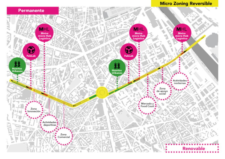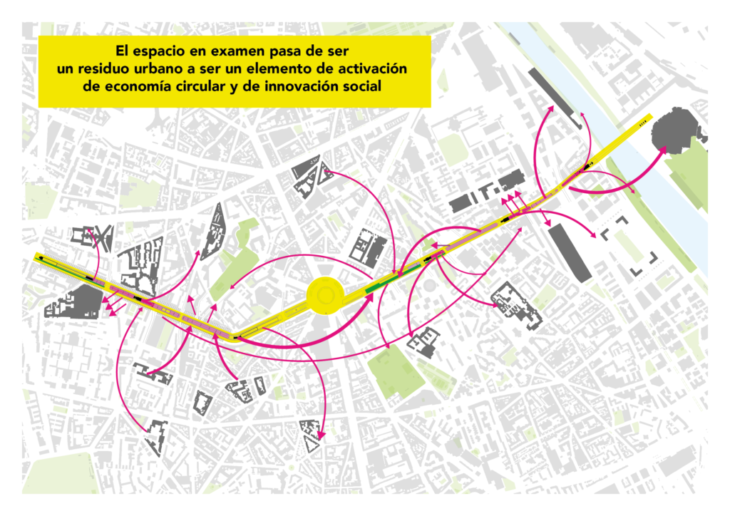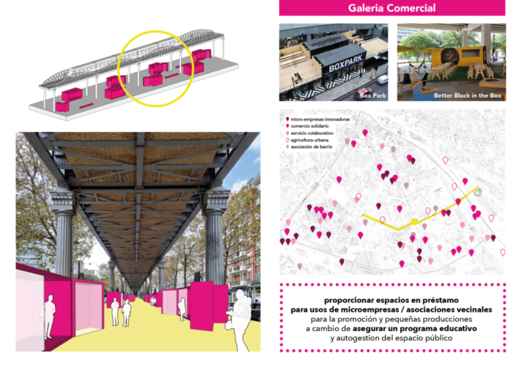 En otros casos, la programación reversible puede dar una nueva identidad a partes del recorrido que actualmente no se perciben como espacio público. Es el caso, por ejemplo, de uno de los segmentos actualmente utilizado como aparcamiento, cuya función se propone cambiar y transformar en una especie de galería comercial a disposición de la densa red de microempresas innovadoras situadas en este sector de la ciudad.