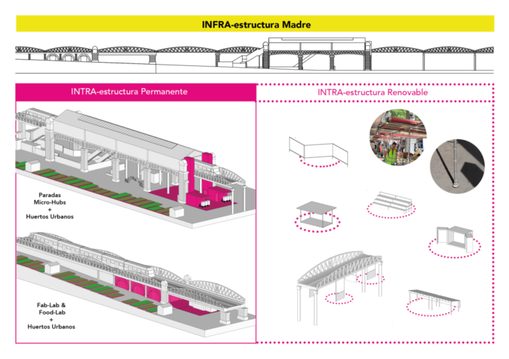 Las intervenciones de diseño propuestas con Underline Paris favorecen un nuevo sistema de relaciones para toda la zona considerada en el caso de estudio. Dentro de la infraestructura de metro preexistente (“infraestructura madre”) se desarrolla una infraestructura parasitaria (“intra-estructura”) que depende de la principal. Así, se distingue entre una intra-estructura permanente, formada por elementos arquitectónicos más estables y estructurales, y una intra-estructura renovable, es decir, pensada con instalaciones ligeras que puedan sustituirse fácilmente a medida que cambia su uso.